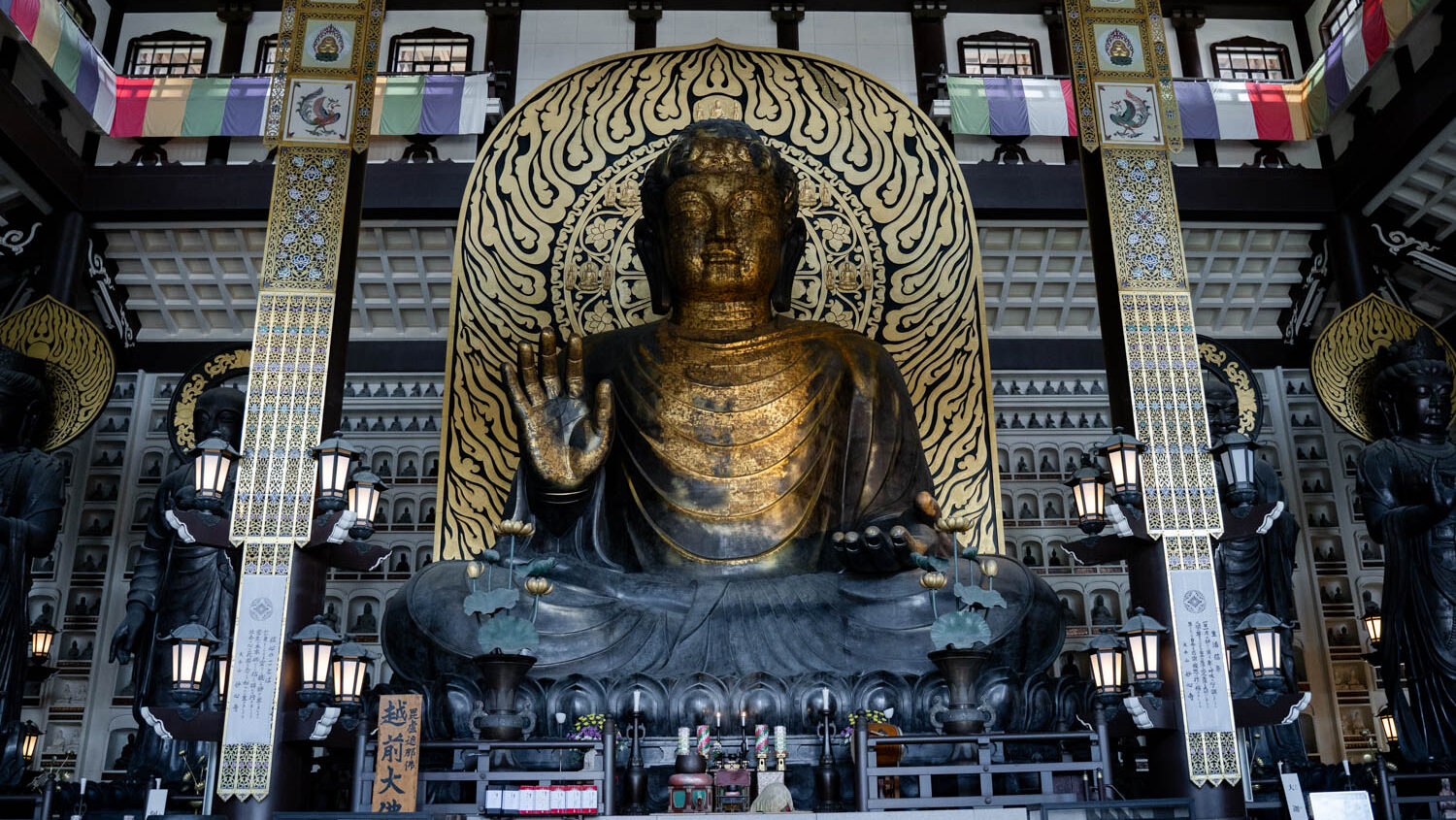 高さ17mの大仏が鎮座する、荘厳な雰囲気の寺院。
